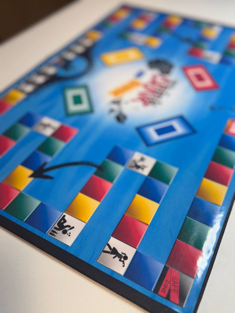Game includes: *Game board(approximately 11x17 inches) *Dice *Dry erase marker *30 Second sand timer *Scoreboard *3 Answer keys *8 Player pieces *8 Life jackets *10 Disposable shot cups *100 Cards(25 of each color) *Plastic storage box for cards and small pieces